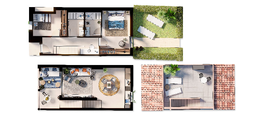 This small and exclusive development has ground floor apartments with private gardens and penthouses with direct access to their own solarium terrace, as well as duplex homes with a garden and solarium terrace.